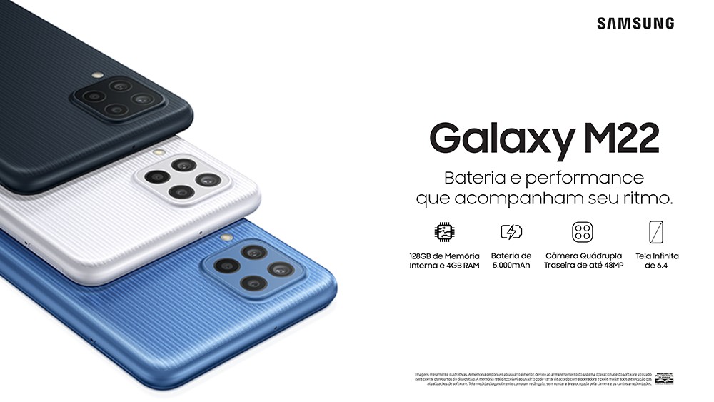O Galaxy M22 está chegando ao Brasil hoje (29) com preço sugerido de R$ 1.799 na loja oficial da Samsung e parceiros do e-commerce em 3 cores: azul, branco e preto.